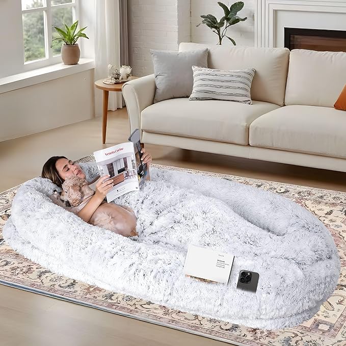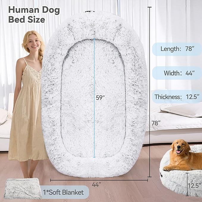 - 【Excellent New Relax & Napping】The Human dog bed can provide a new way to enjoy better rest and napping; human dog bed can even accommodate you and your pet to rest and play in it at the same time,we're sending a BONUS exquisite workmanship faux plush blanket of the same material.
