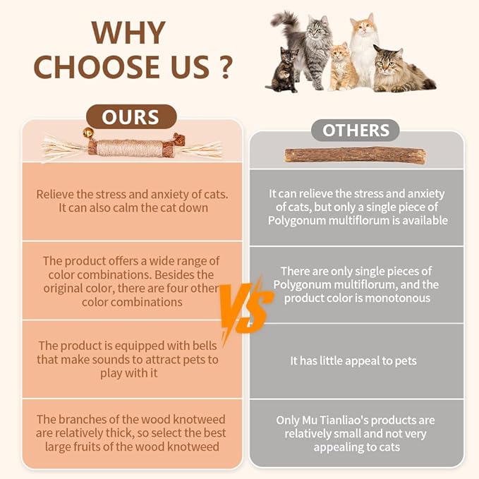 - 1.【100% Natural & Safe Ingredients】Our cat chew sticks,are crafted from pure silvervine (matatabi), silvervine gall fruits, raffia grass, and hemp rope—all 100% natural, non-toxic, and safe for cats to chew, bite, and play with. Each stick, whether it's a kitten chew stick or a silvervine stick for cats, is uniquely designed with a small cat bell attached, adding an extra layer of fun without compromising safety. Free from artificial additives, these cat chew toys let your feline friend, from kittens to adults, sniff, cuddle, kick, and gnaw without worry. They're even suitable as kitten teething chew toys, making them a trusted choice for pet parents seeking safe kitty toys.