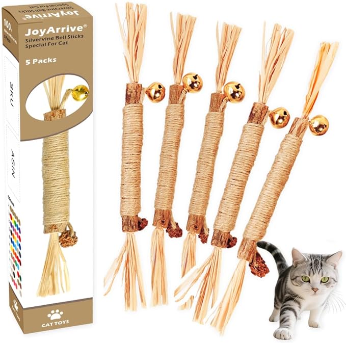 - 1.【100% Natural & Safe Ingredients】Our cat chew sticks, are crafted from pure silvervine (matatabi), silvervine gall fruits, raffia grass, and hemp rope—all 100% natural, non-toxic, and safe for cats to chew, bite, and play with. Each stick, whether it's a kitten chew stick or a silvervine stick for cats, is uniquely designed with a small cat bell attached, adding an extra layer of fun without compromising safety. Free from artificial additives, these cat chew toys let your feline friend, from kittens to adults, sniff, cuddle, kick, and gnaw without worry. They're even suitable as kitten teething chew toys, making them a trusted choice for pet parents seeking safe kitty toys.