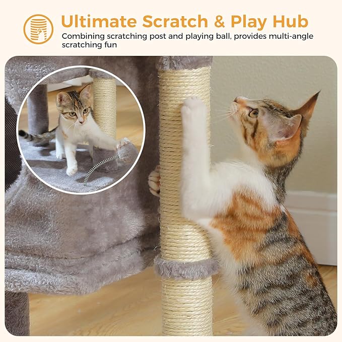 - Satisfy Scratching Needs:Equipped with 2 sturdy sisal-covered scratching posts, this cat tree effectively satisfies your cat’s natural urge to scratch and sharpen their claws. It helps protect your furniture from unwanted damage while keeping your cat entertained.