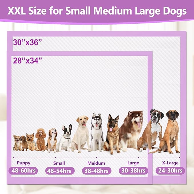 - Extra-large size (30 inch * 36 inch) for large dogs and small dogs use - These wee wee pads extra -large are suitable for all size dogs for pet potty training, aging pet assist, travel carrier, puppy tray, on car, covering water/ food bowl spillage.