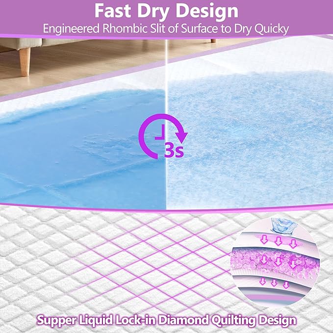 - 6 strong layers + supper liquid lock-in diamond quilting design absorb liquid faster for dry surface – With non-woven fabric for anti-streaming, polymer core to turn liquid into gel, 2 layers quick drying super absorbent tissue, diamond quilting design, these potty pads for dogs lock in moisture faster. No more sprinkles on the wall or wet footprints on wooden floor.