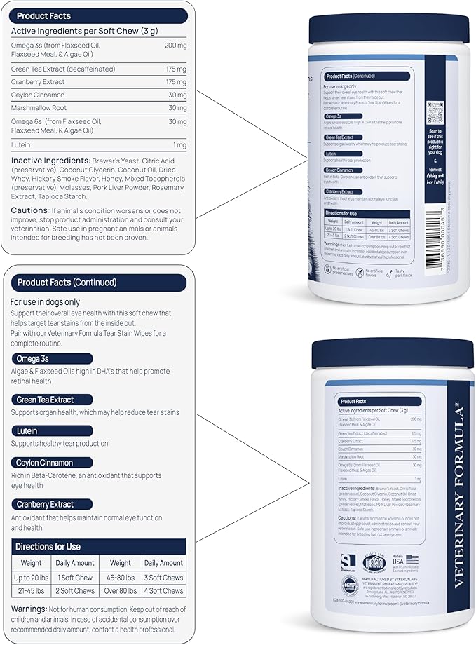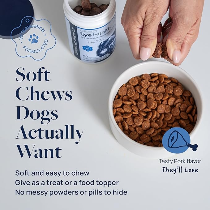 - VET-FORMULATED & TRUSTED QUALITY – Made in the USA in a cGMP-compliant facility with the NASC Quality Seal. These soft chews are vet-formulated and made without artificial flavors or preservatives, so daily eye care is simple and dog-approved.
