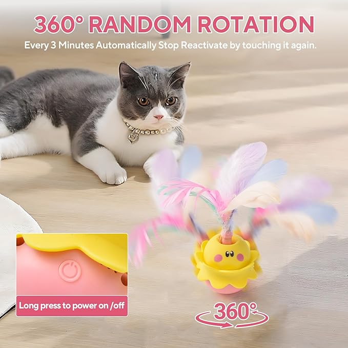 - 【Energy-Saving Mode】Long Press to turn on the power, then touch the electronic cat toy to activate it. The toy will spin for 3minutes and stop automatically. Reactivate by touching the automatic cat toys again. If untouched for for more than 5 hours, this cat feather toy will turn off completely to save battery.