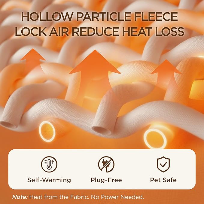 - Self-Warming Fabric: Hollow-core heat-trapping fibers lock in still air to reduce heat loss and naturally sustain your pet’s body warmth, keeping them cozy through winter naps