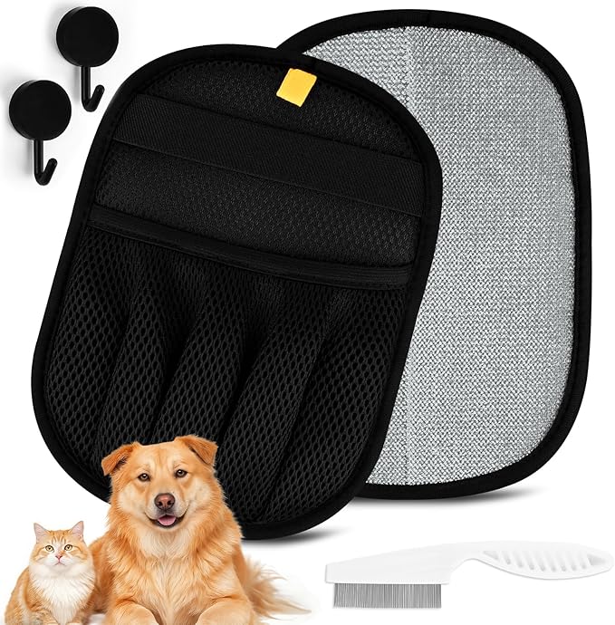 - Includes 2 × static pet hair removal gloves, 1 × hair removal comb, and 2× hooks. After use, you can use a comb to remove the hair collected on the gloves. The hook is convenient for storage and can be accessed.