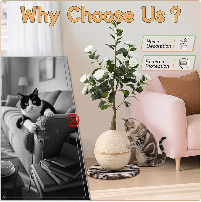 - 【Unique Camellia Tree Design】Our designers combined beautiful camellias with a sisal cat scratching ball and a solid tie-dye fabric-covered base for a cat scratching post that combines design aesthetics with functionality that both you and your cat will love