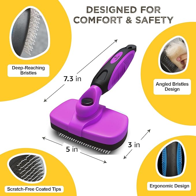 - EASY SELF CLEAN: Cleaning up after grooming is a breeze with the self-cleaning feature. Simply press the button to retract the bristles, instantly dropping the collected hair, allowing for quick and hassle-free disposal.