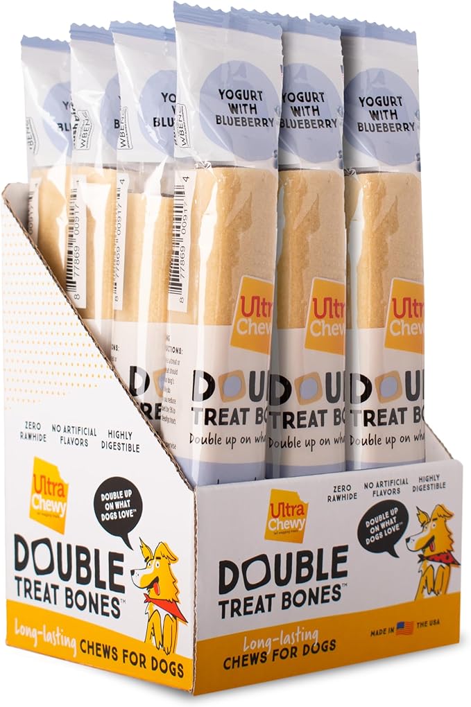 Ultra Chewy Yogurt with Blueberry Double Treat Bones: Long-Lasting Dog Treats Made in USA for Large and Small Breeds, Highly Digestible (12 Count)