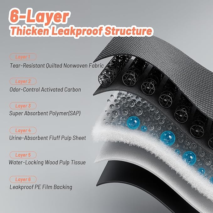 - Super Absorbent & Quick Drying: The 6-layer protection design makes our xl puppy pee pads much more absorbent than other dog training pads, perforated film as the top layer of the incontinence pads which can speed up the liquid to pass through the surface than common non-woven fabric and keep the surface quick-drying