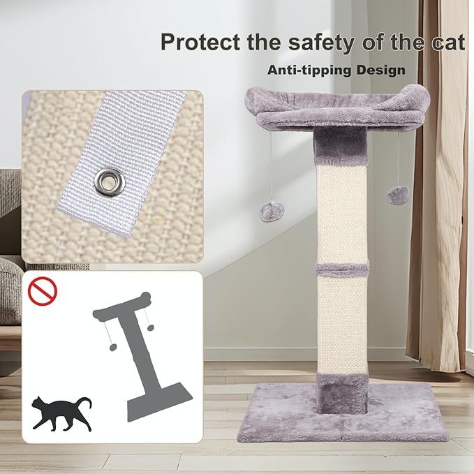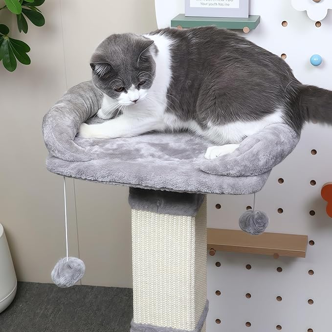 34" Tall Cat Scratching Post with Bed, Sisal Scratch Posts Trees with Plush Perch and Hanging Ball for Indoor Cats, Removable Cover, Large Scratch Post and Base, Rugged and Durable, Light Grey