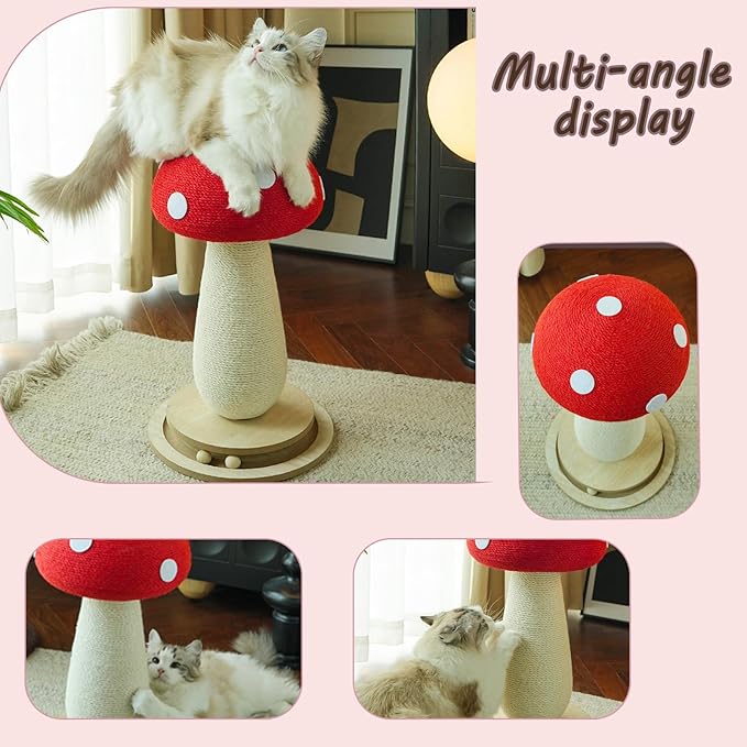 - 【🍄 3-in-1 Mushroom Design: Scratch, Play & Lounge】 Scratch on natural sisal rope, play with the interactive rolling ball, and lounge on the spacious 10-inch mushroom cap. This all-in-one center satisfies instincts and saves your furniture in one stylish, compact piece