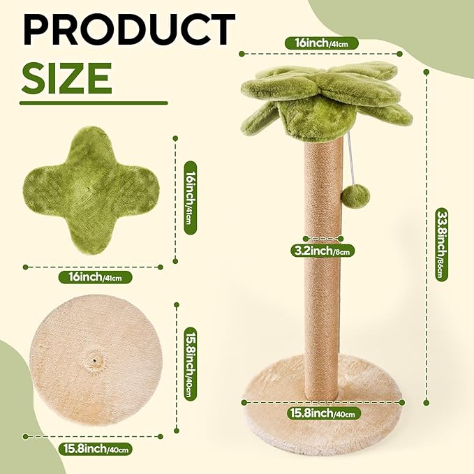 - 🌴. Size for All Cats: The scratching post is 33.8" tall to provide a comfortable stretch for a good full-body workout. 15.7 inches round scratcher's base is thicker and wider, 3.1" diameter scratch post is robust enough to handle vigorous scratching, making it suitable for both kittens and adult cats of all sizes.