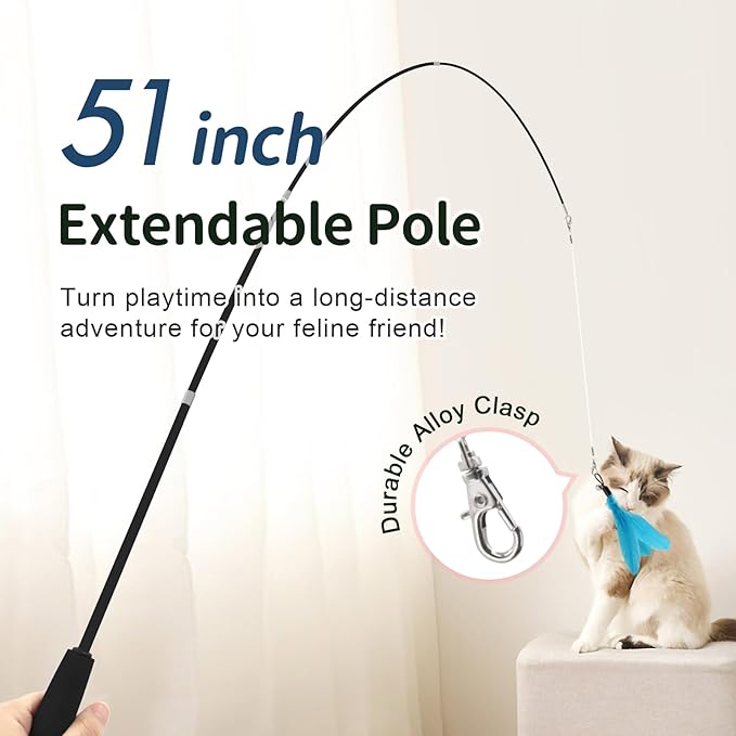 - [Flexible Cat Wand] Designed for durability and fun, our cat wand features an EVA non-slip handle and a retractable shaft that extends from 15 to 51 inches—making it easy to store and carry. It includes two types of lines: a nearly invisible transparent fishing line that makes toys resemble flying birds, and a highly elastic bungee cord perfect for jumping and pouncing games