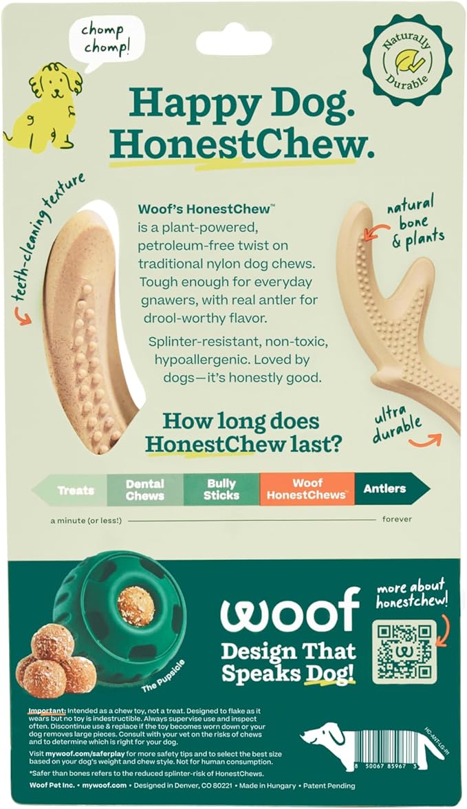 WOOF HonestChew Dog Toy Antler - Durable Dog Chews - Made with Natural, Plant-Based Ingredients - Splinter-Resistant - Great for German Shepherds and Pit Bulls - Large
