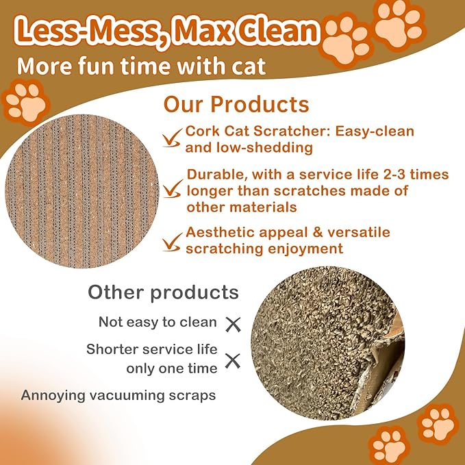 - đżăNew material combination--Cork& Corrugated BlendăThis cat scratcher say goodbye to messy scraps! Our innovative blend of natural cork and durable cardboard provides superior grip and enjoyment, stimulating cats' natural scratching instincts while being gentle on paws.