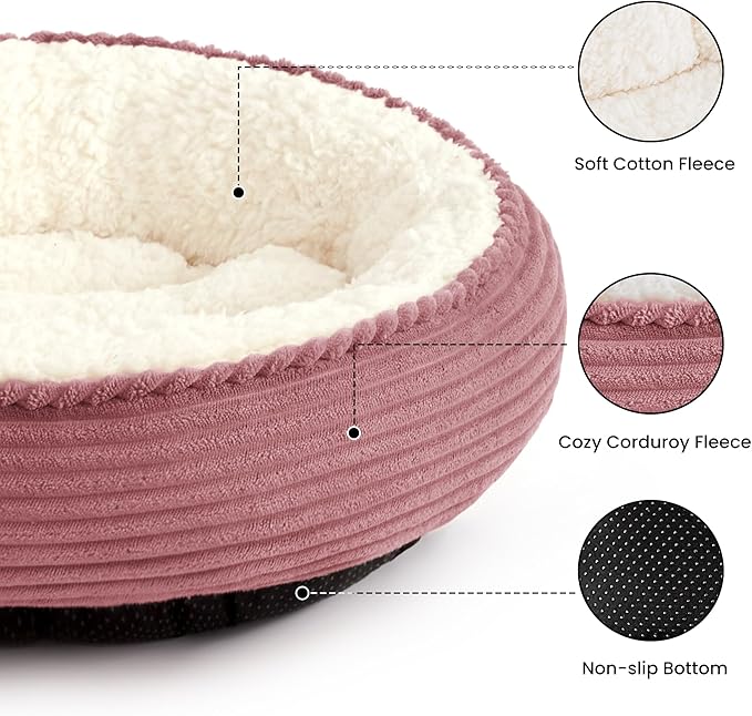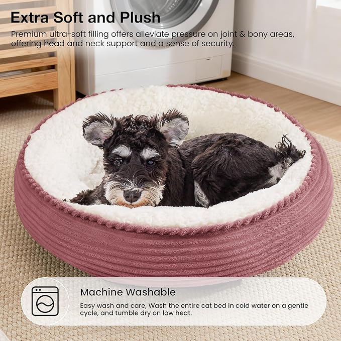 - Donut Cuddler Shape: The round dog bed allows pets to curl up while the raised rim creates a sense of security and provides head and neck support. Premium ultra-soft filling offers joint and muscle pain relief, is a great choice for elderly or sick dog pets. The 25 inch round pet bed is perfect for cat or puppy and other pets up to 25 lbs.