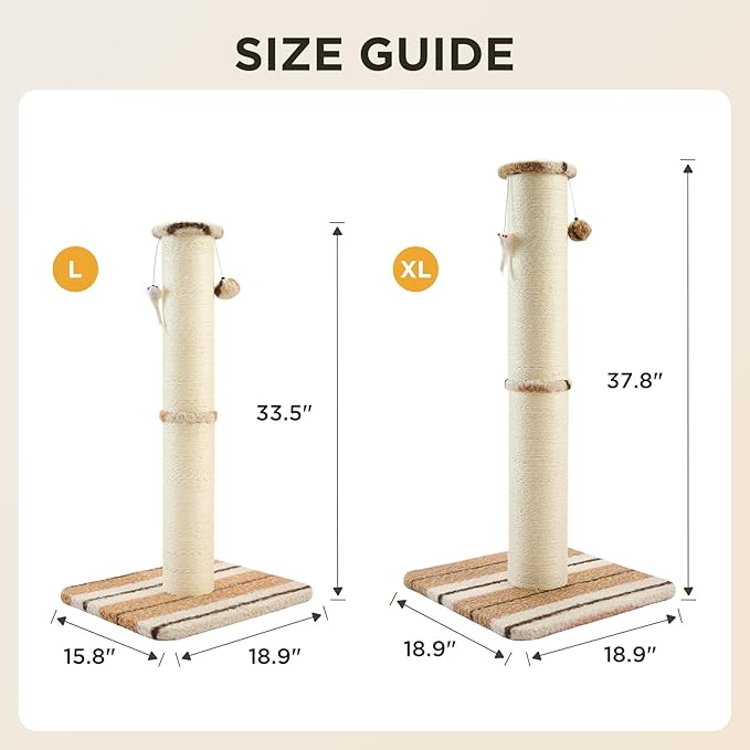 - Extra-Tall: Large scratching post often feature an extra-tall design, providing cats with an extended vertical surface to stretch and fully engage their muscles. 38inch height allows cats to indulge in their natural climbing instincts and provides them with a secure and satisfying scratching experience.