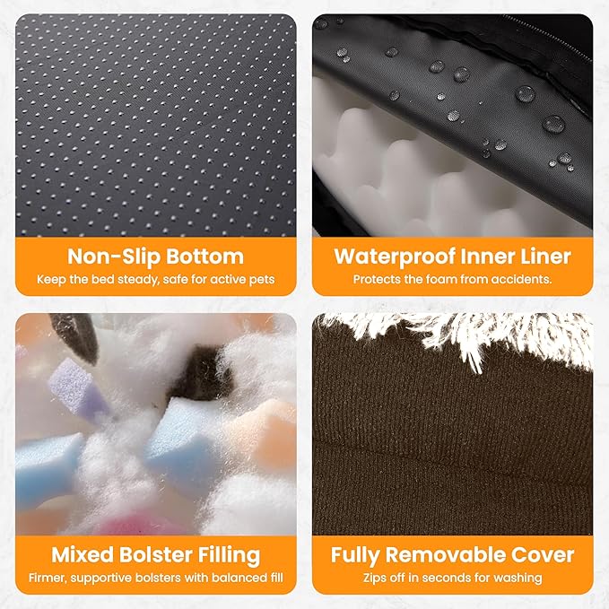 - Easy Care & Practical Details – Real life = shedding, drool, and spills. The removable, machine-washable cover plus waterproof inner liner protect the orthopedic foam; the non-slip bottom keeps the bed in place on wood or tile. Ideal for multi-dog homes and daily use.
