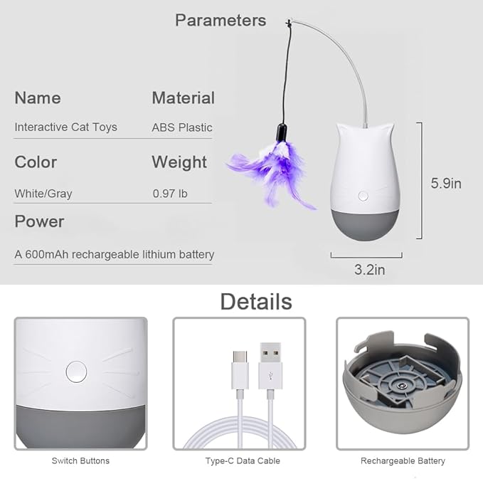 - Rechargeable Battery & 15-Min Auto-Shutoff: Skip frequent battery replacements—this interactive cat toy uses a rechargeable battery, so just charge it up for instant play whenever your cat wants to chase. It also shuts off automatically after 15 minutes, preventing overexercising great for kittens or senior cats, and saving you from manually turning it off. Suitable for busy pet parents who want convenient fun.