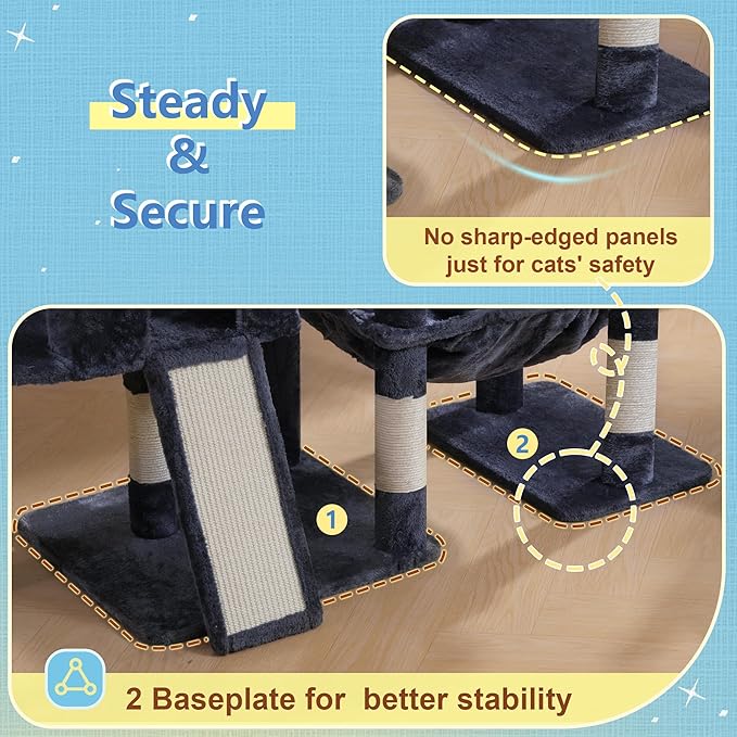 - Stable and Safe: The cat tower is supported by two separate base plates—dividing the base into two parts maximizes its stability. All panels of the cat tree tower feature rounded corner design with no sharp edges, protecting both owners and kitties from bumps