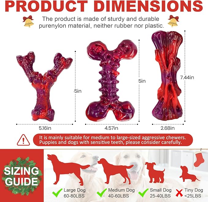Indestructible Dog Toys for Aggressive Chewers 3-Pack: Tough Nylon Chew Toys for Medium & Large Dogs 25–80 lbs, Beef Flavor, Heavy-Duty Dog Chew Bone, Holiday Dog Gift (Red)