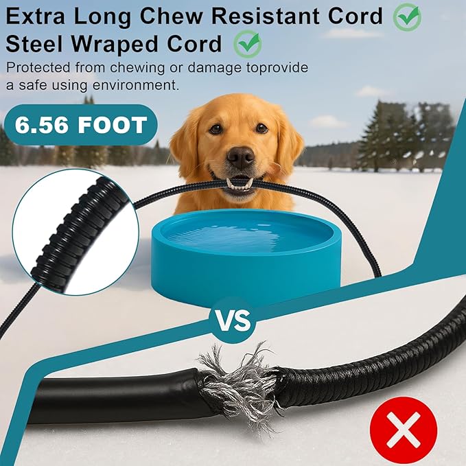 - Pet-Friendly Design - the outdoor heat bowl Features a 6.56-foot, chew-resistant steel-sheathed power cord and fully sealed electronics for enhanced safety both inside and outside. No bright indicator light to startle your pet, allowing them to drink comfortably without eye strain.