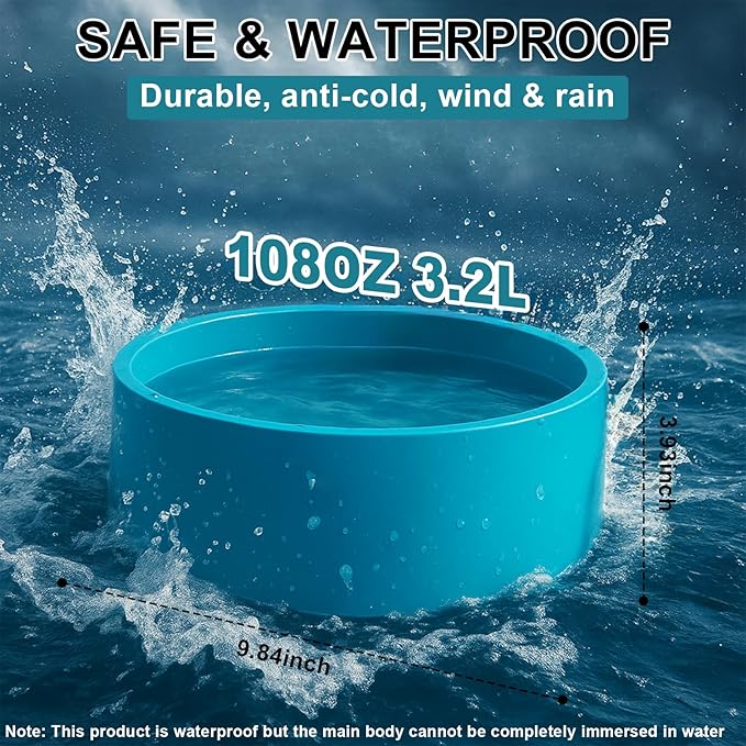 - Large Capacity - animal bowl holds 3.2L(108 ounces) of water, making it ideal for medium to large pets or multiple-pet households. The upgraded waterproof construction withstands outdoor conditions that is ideal for use on a patio, garage, barn, or backyard.