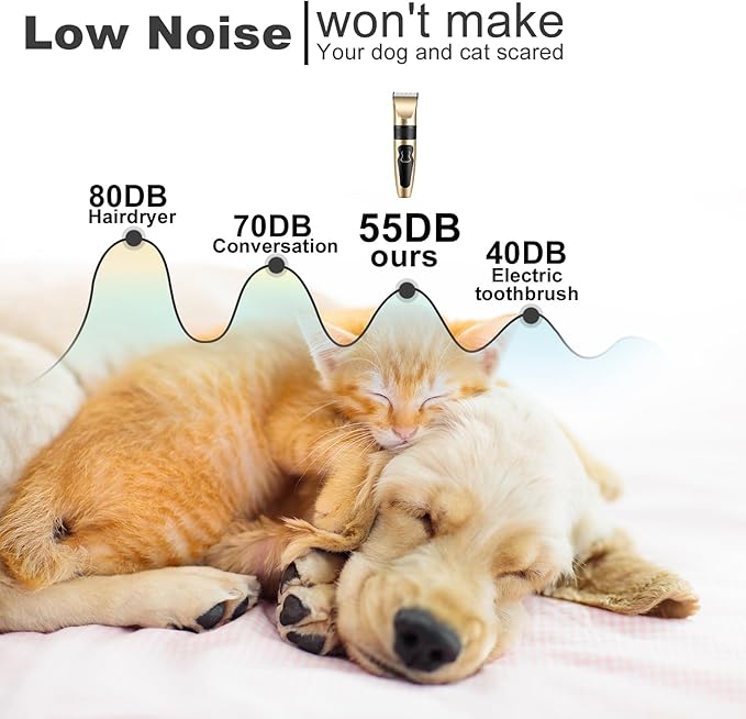 - 【Low Vibration & Quiet Design】The noise level of the pet clipper is only about 50 decibels when idling, so neither dogs nor cats will be frightened by the sound. It allows you to easily achieve affordable and simple at-home pet grooming.