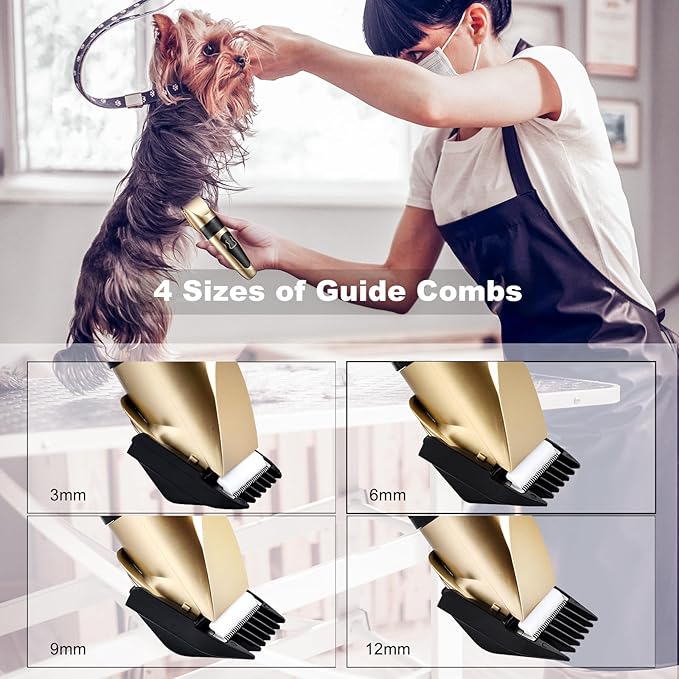 - 【Multi-Size Guide Combs】The package includes 4 replacement guide combs in different sizes (1.5mm / 3mm / 4.5mm / 6mm) for flexible length adjustment. The guide combs are quick to attach and detach, with versatile functions. With these multi-functional guide combs, beginners can easily become "pros" and create their desired pet styles at will.