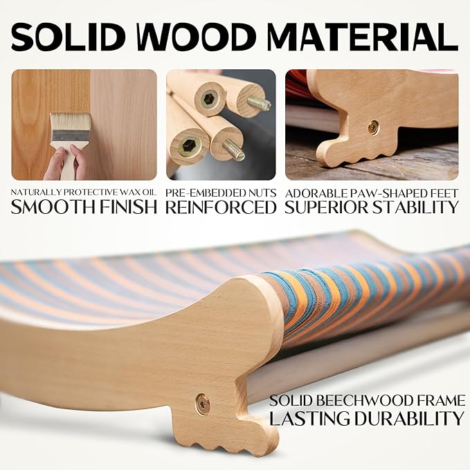 - Durable natural beech wood frame with a smooth finish for stability and rustic charm, featuring cat-shaped feet for added safety.