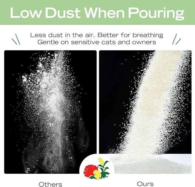 - LOW DUST: Minimal dust while pouring or scooping keeps the air clean—better for your cat’s breathing and your furniture. No silica or clay dust for a truly dust-free cat litter experience.
