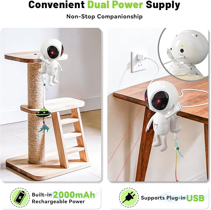 - Continuous Dual-Power Operation for Non-Stop Companionship: Designed for long-lasting play, it includes a built-in 2000mAh rechargeable power and supports continuous plug-in use. This automatic cat toys provides persistent companionship through timed activation and sensor motion, helping reduce cat boredom and anxiety by offering regular stimulation and exercise.