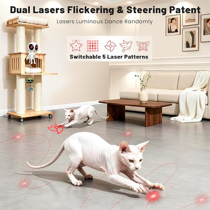 - Unpredictable Movement Flickering & Steering Patented: ORSDA exclusive patented laser program mimics elusive prey. The shaking dual lasers and alien head rotation create zig-zag, twist, disappear, surprise that cats can't resist. Simultaneous differential movement of both eyes. One eye projects 5 interchangeable laser patterns (like scatter dots, butterflies), adding variety and sustaining your cat's interest during interactive cat play sessions.