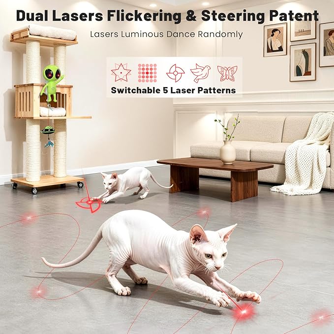 - Unpredictable Movement Flickering & Steering Patented: ORSDA exclusive patented laser program mimics elusive prey. The shaking dual lasers and alien head rotation create zig-zag, twist, disappear, surprise that cats can't resist. Simultaneous differential movement of both eyes. One eye projects 5 interchangeable laser patterns (like scatter dots, butterflies), adding variety and sustaining your cat's interest during interactive cat play sessions.
