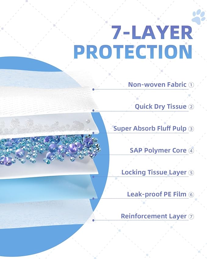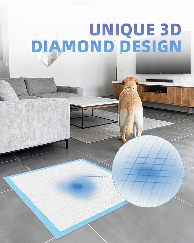 - 【Leak-Proof & Protection】 Our puppy pads have a diamond quilting design for quick absorption and water-locking. The PE film bottom layer offers reliable leak protection, safeguarding floors and furniture from pet urine damage, ensuring hassle-free cleanup.