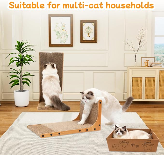 - Versatile Uses: This 3-in-1 design offers the best of both worlds for your cat. The flat cardboard scratching board provides a cozy spot for curling up, scratching, and resting, giving your cat a strong sense of security. Meanwhile, the L-shaped scratcher creates a versatile space for lounging, napping, or standing to stretch and scratch, offering them the freedom to claw as they please;