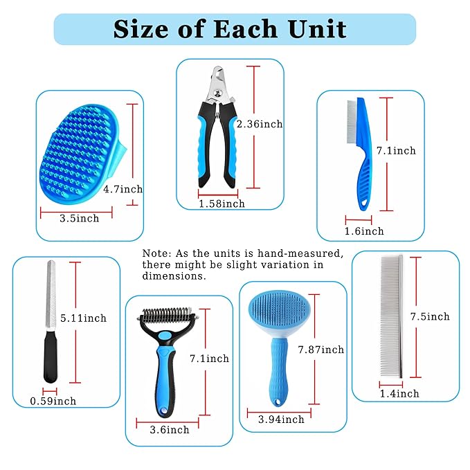 - 【7 Specialized Tools for Total Coat & Nail Care】 Tackle every grooming task with one convenient set. This professional-grade kit includes: Magic Glove: Perfect for bathing & massage, turning grooming into a pleasant petting session. Deshedding Comb: Effortlessly removes loose undercoat and reduces shedding around your home. Flea & Steel Comb: Features finely spaced teeth to effectively remove fleas, dirt, and debris. Dematter Rake: Safely cuts through and removes tough mats and tangles without irritation. Nail Clipper Set: Ensures a safe, clean, and stress-free trim for purr-fect paws.