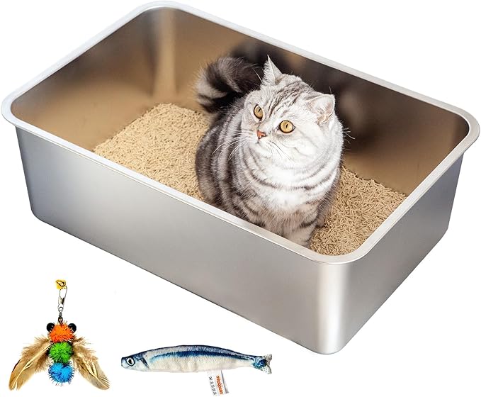 XXL Stainless Steel Cat Litter Box, Includes Catnip Fish Toy & Wand Feather Toy Refill, Extra-Large Metal Litter Pan for Big Cats & Multi-Cat Homes, Pet Toilet Supplies for Kitten