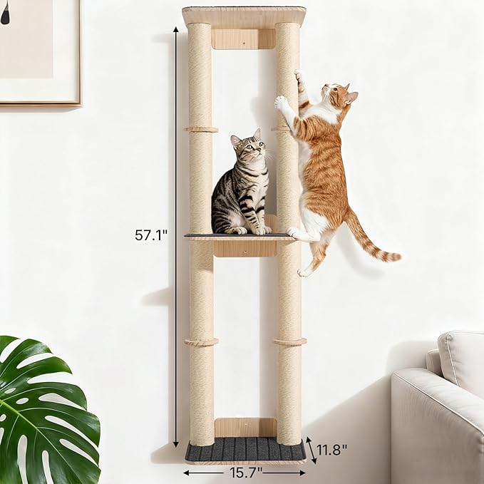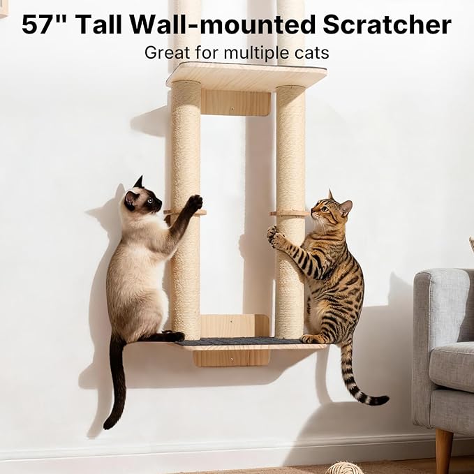 - Dual Scratch Post for Multi-Cat Fun: Save your furniture with this robust wall mounted cat scratcher. Features a vertical dual-post design reaching 57" high. It provides ample space for cats to stretch, play, and sharpen their claws