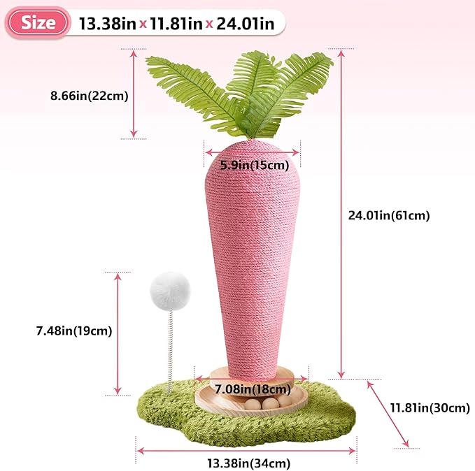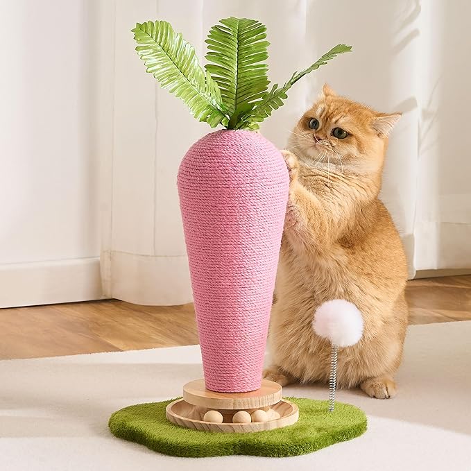 - đ„ăAdorable Carrot DesignăThis cat scratching post features a charming carrot shape with realistic leaf toys, adding a playful touch to your home while keeping your cat entertained. Includes Catnip and a Wooden Turntable Toy to stimulate your cat's curiosity and encourage active play, promoting physical and mental health.