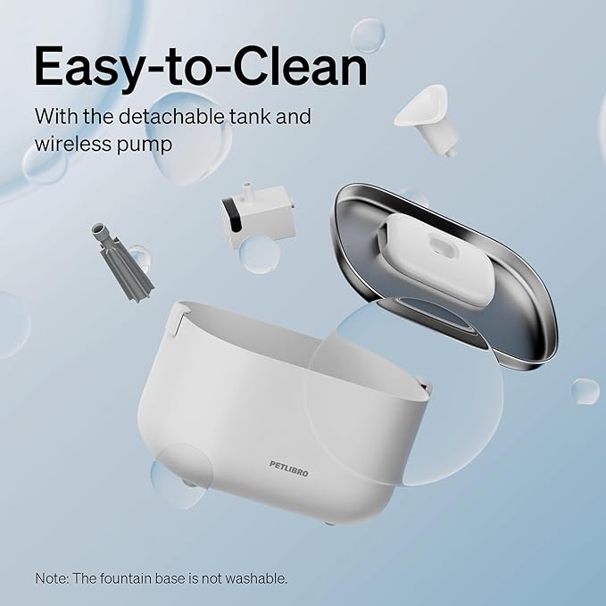 - Easy to Clean & Install: The cat fountain features a detachable water tank design for easy refilling. The wireless water pump is easier to detach than a wired one, and there are no tangled cables to worry about when cleaning the pump and tank. (This pet water dispenser for cats is wall-powered. Only the water pump is wireless)