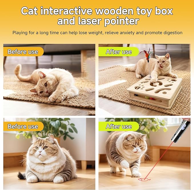 Cat Toy Set - Include 1 Interactive Wooden Puzzle Cat Toy Box & 7 in 1 Modes Adjustable Laser Pointer, Indoor Hunting Exercise Play Toy to Stimulate Your Cat’s Energy and Instincts