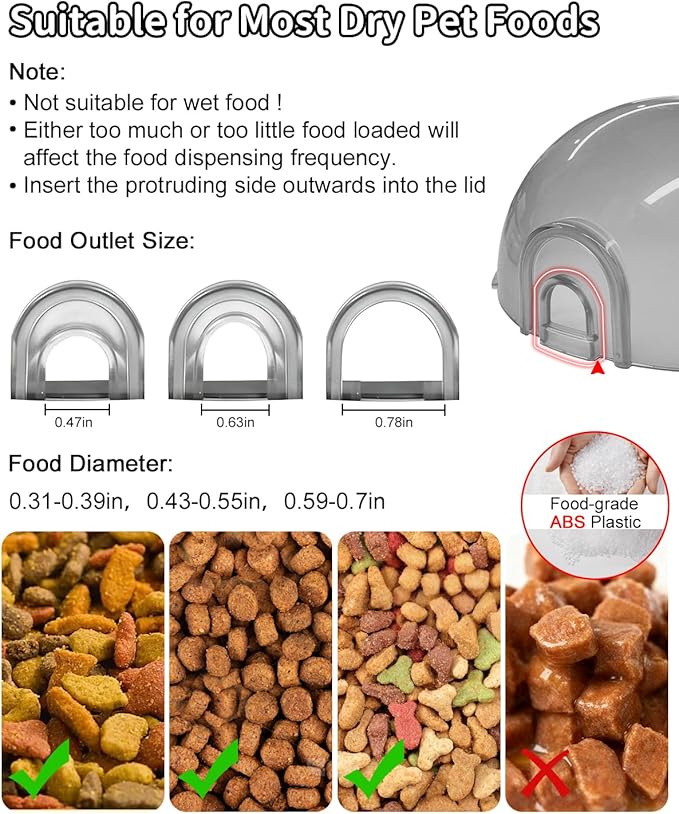 - Customizable Slow Feeder: This cat food dispenser has 3 different hole sizes, which can accommodate most types of dry kibble and treats. Simply switch between the outlet inserts to control the treat type and dispensing speed, helping prevent gobbling and promoting healthier eating habits for your pet