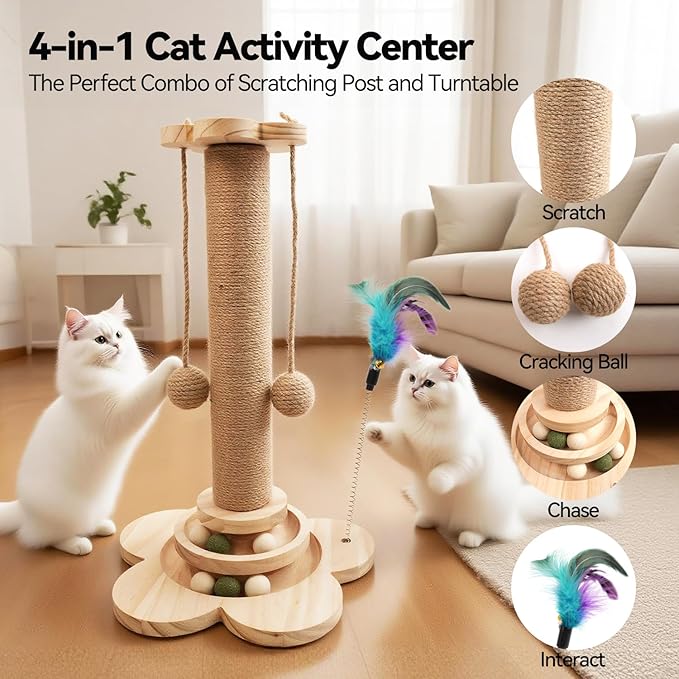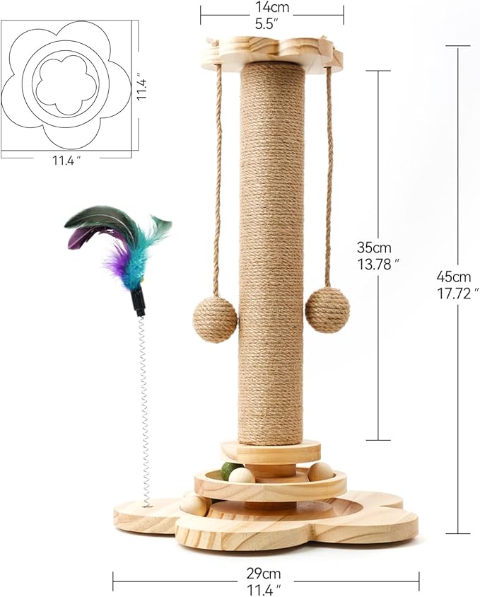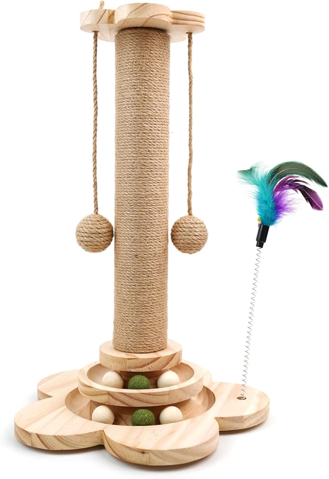 Cat Scratching Post, 4 in 1 Wooden Cat Scratcher Toy, 18.11" Tall Scratch Post with 2 Level Cat Track Balls, Interactive Feather Toy and 2 Sisal Hanging Balls for Indoor Kittens, Adult Cats