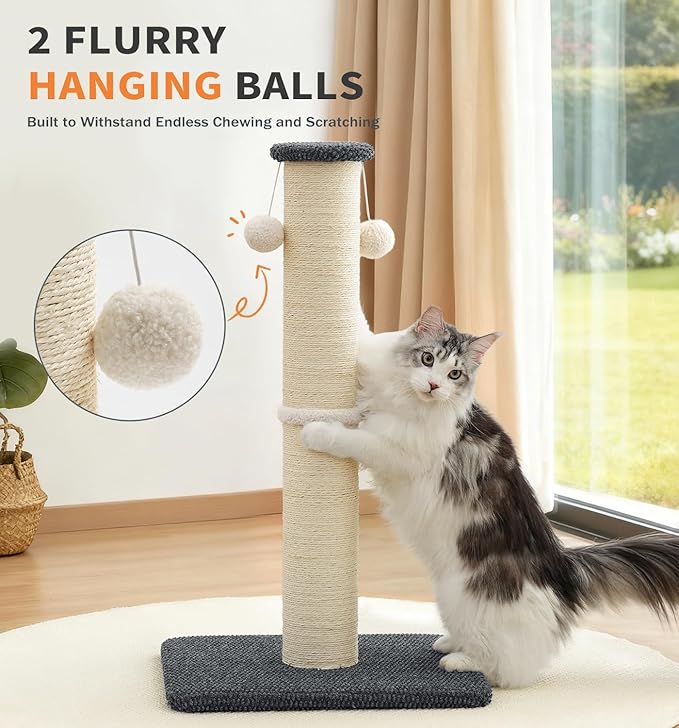 - Full Sisal-Wrapped Scratching Surface: The scratch post is covered in 100% premium natural sisal, offering a firm, durable, high-friction texture that satisfies active scratchers while helping protect your furniture, supporting healthy scratching habits and long-term nail maintenance.