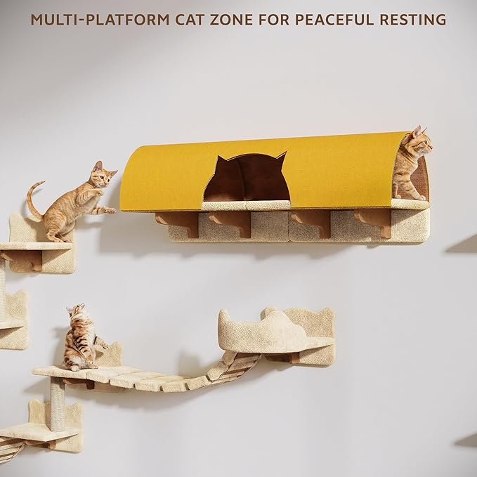 - 20-in-1 Cat Wall Shelves: Transform your vacant walls become a cat amusement spot! Wall mounted cat furniture(20 piece set) includes cozy plush, 63''H cat tower, 40''L tunnel, moon hammock, cat house, scratch post, spacious shelves and bridge ladder. Saves space, keeps floors tidy - Great for small places or multi-cat families. You can fully unleash imagination to design the position of each part of the cat shelves, tailor a unique cat climbing wall systems for your cat