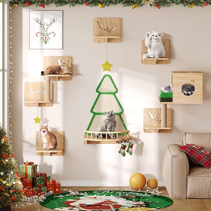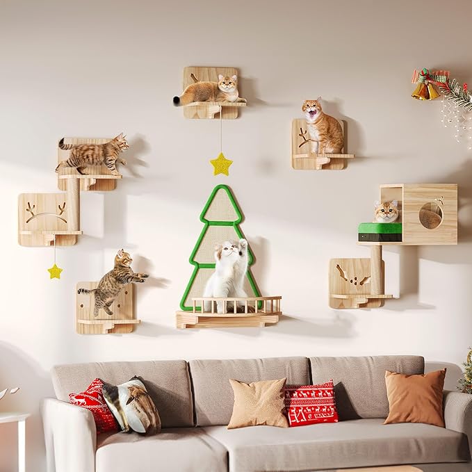 - 15-in-1 Cat Furniture: Turn your vacant wall into a cat's dream playground, has cat house, scratching post, spacious shelves, hanging stars, Christmas tree decorations, cushion and cat bowl, that allow active kitties to climb, lounge, and explore to their heart's content, all while keeping your floor space open and organized. Unleash your creativity to arrange each component, crafting a unique cat climbing wall systems tailored to your feline friends