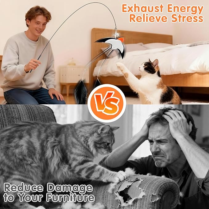 - VERSATILE 2-PIECE CAT TEASER SET This 2-piece cat toy includes a long-tail swallow attachment and interactive feather wand, offering flexible hands-free self-play or owner bonding for indoor kittens and cats.