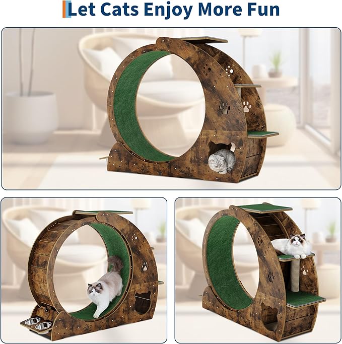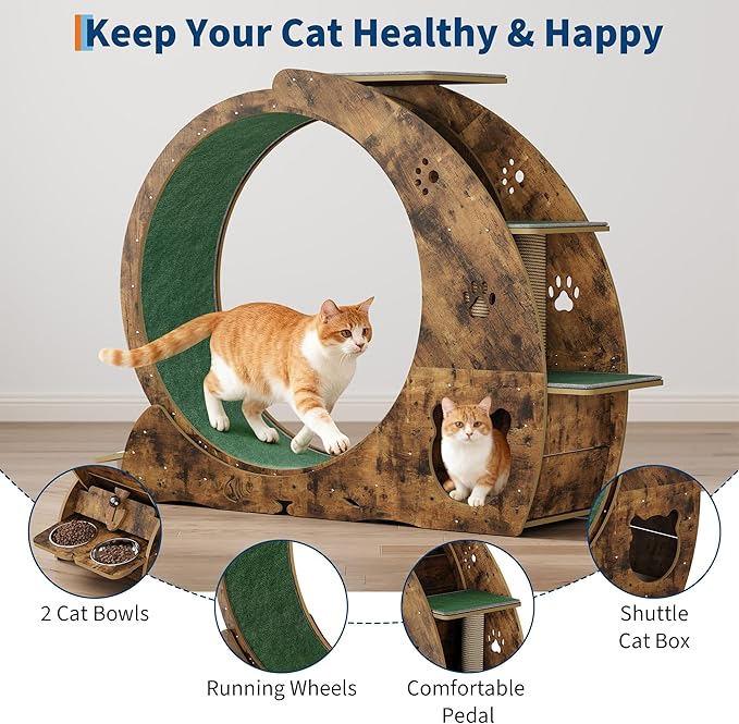 - 【Innovative 4-in-1 Design】 This isn't just a running wheel—it's a complete activity center. It combines a high-speed treadmill, a durable scratching pad, a playful roller, and a rest spot, giving your cat everything they need to stay active and content indoors.